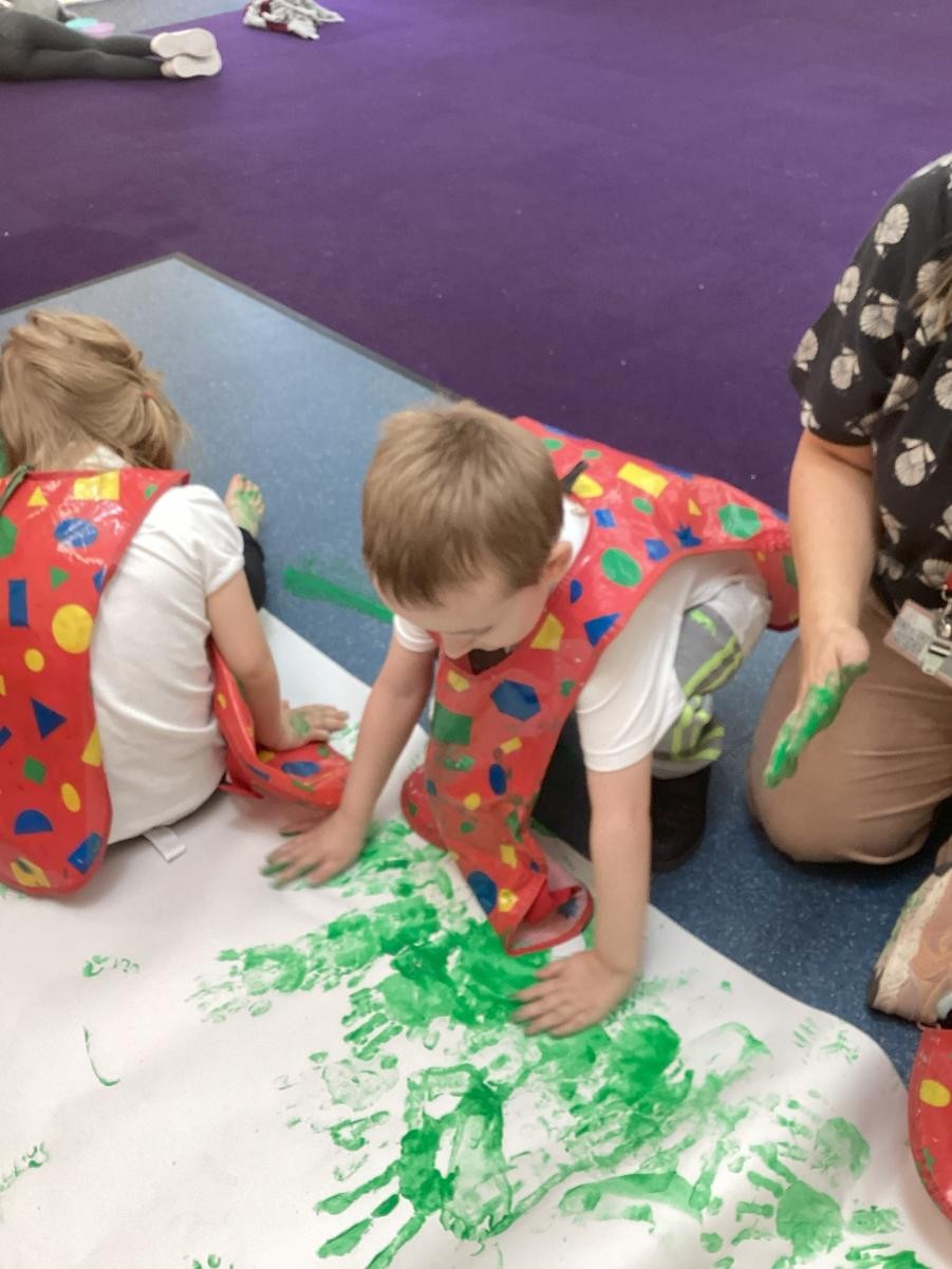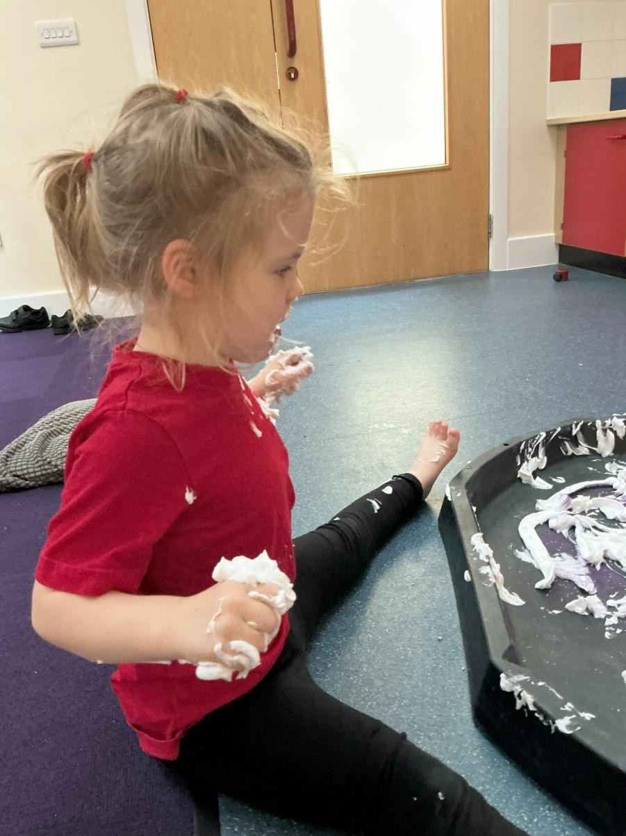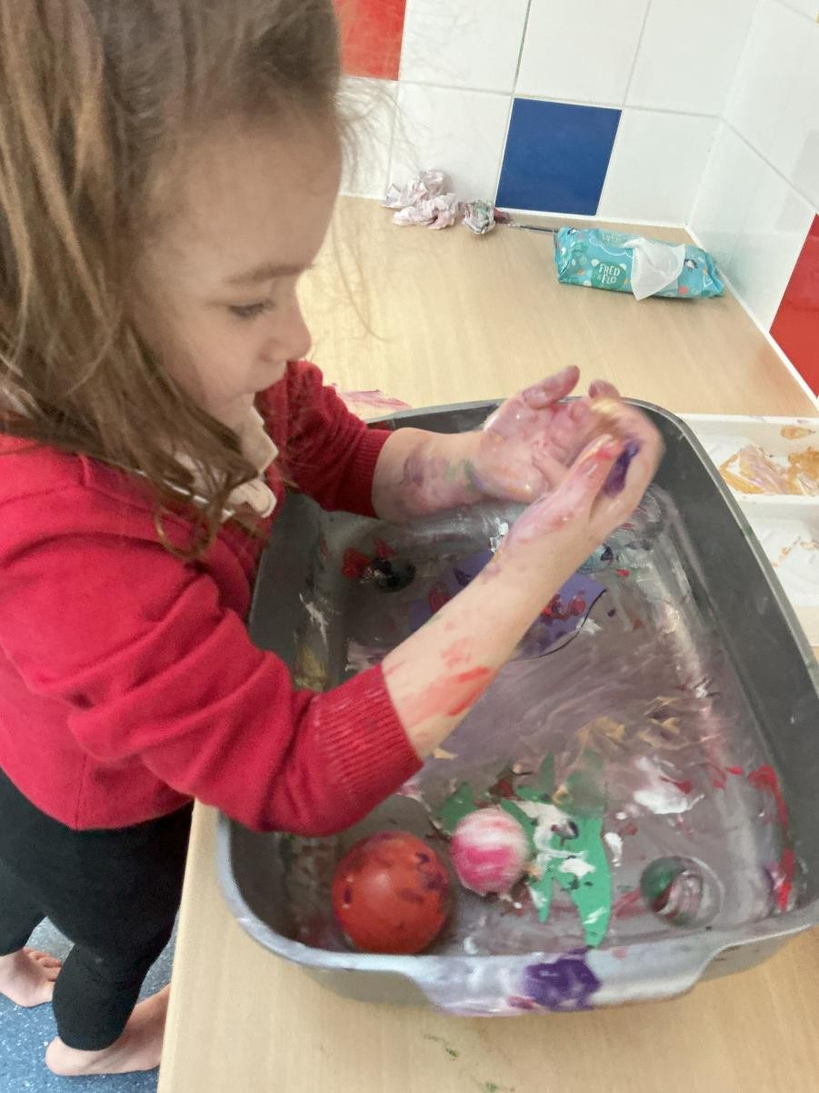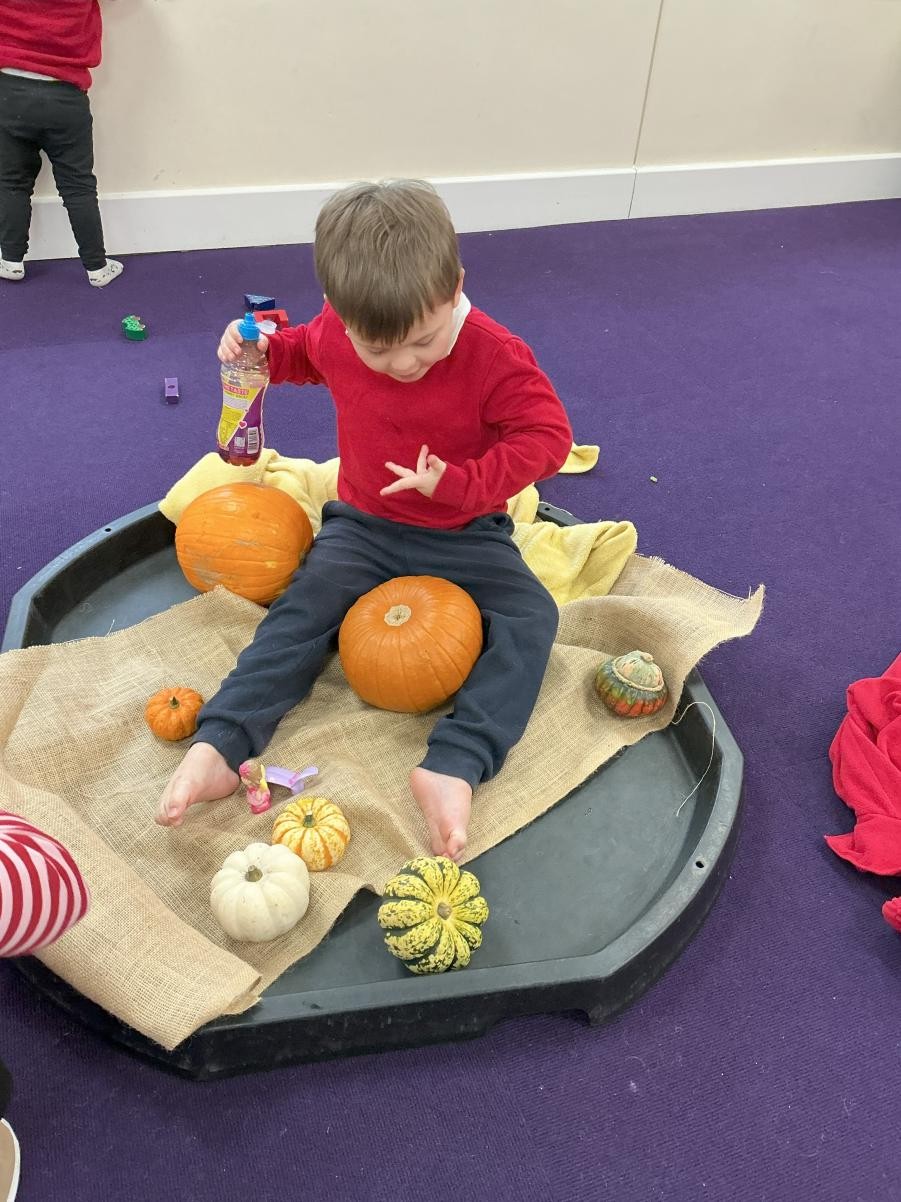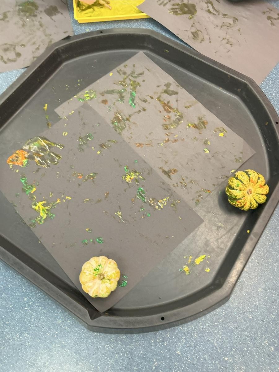 We all had fun foot printing with orange paint and creating green handprints, which are going to be cut out to create carrots for a display at the harvest festival in Ely cathedral. We have also explored cooked spaghetti and painting primary colours using large paint brushes during messy play sessions this week.
