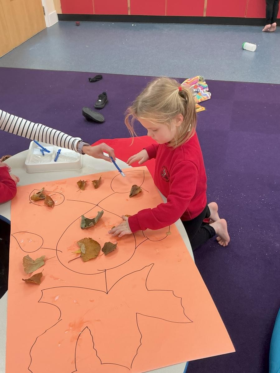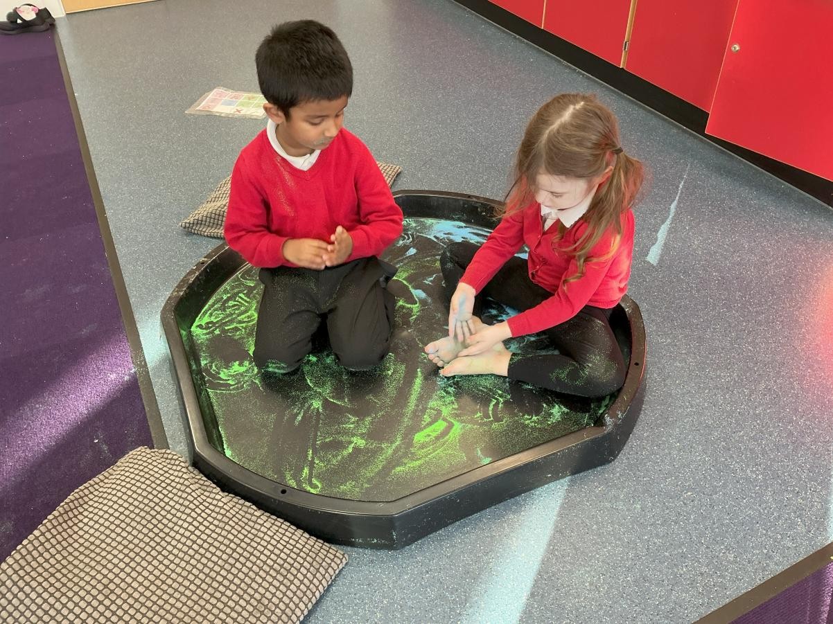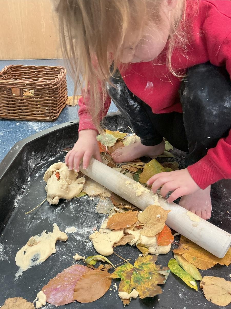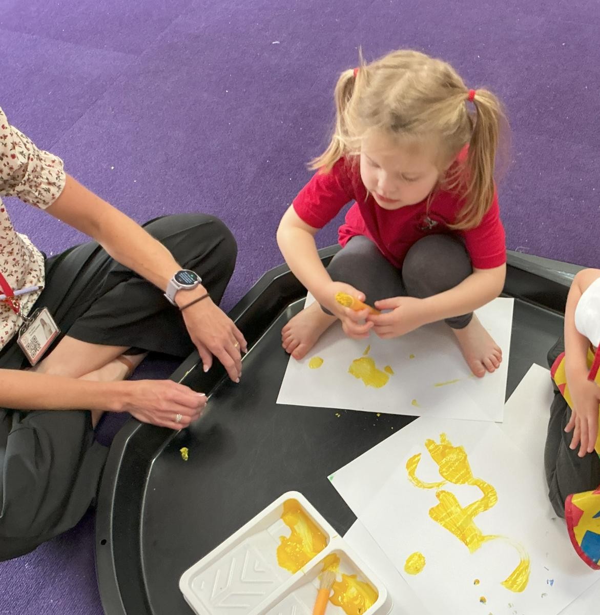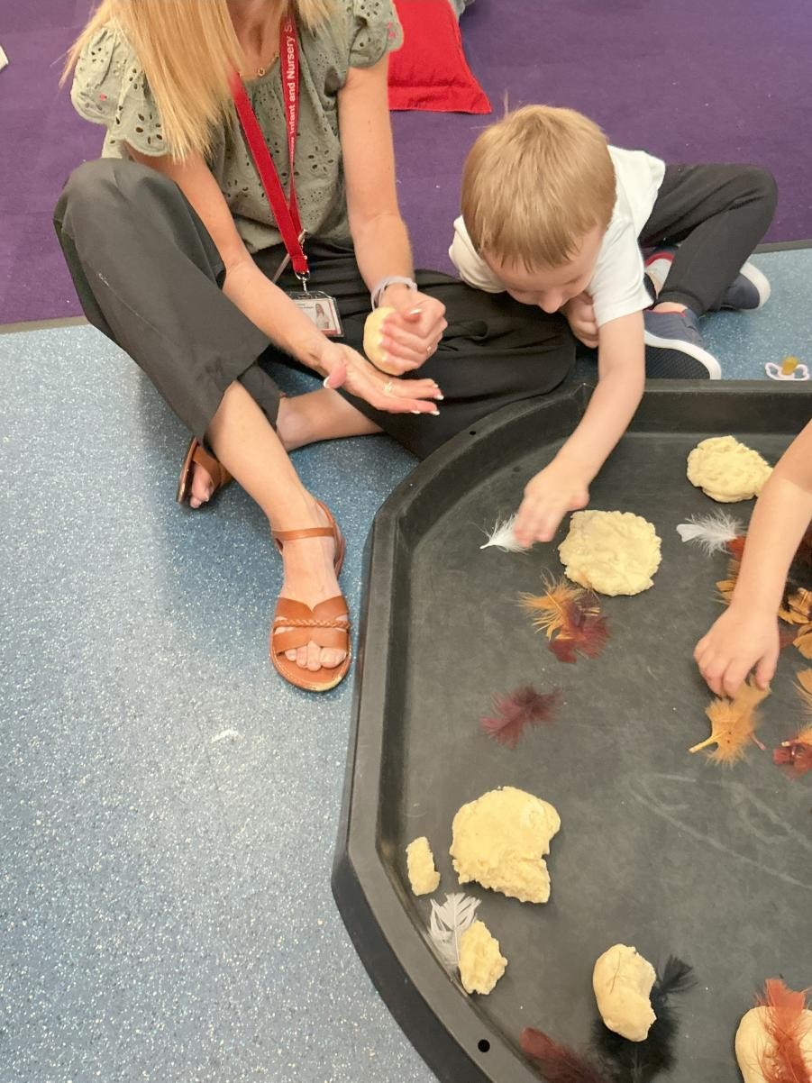 We all had fun foot printing with orange paint and creating green handprints, which are going to be cut out to create carrots for a display at the harvest festival in Ely cathedral. We have also explored cooked spaghetti and painting primary colours using large paint brushes during messy play sessions this week.