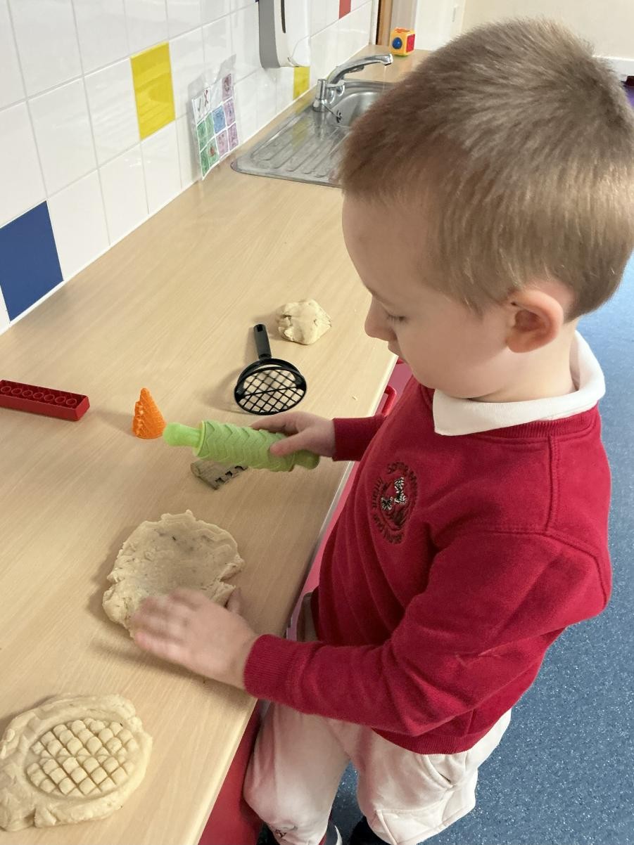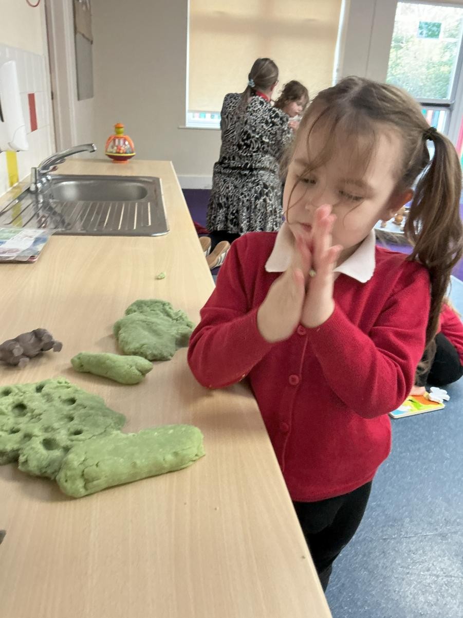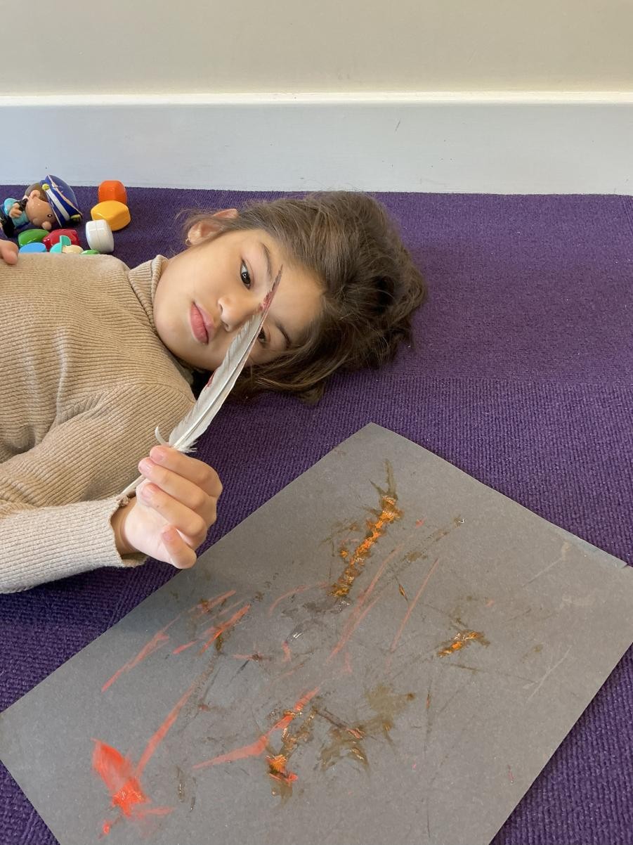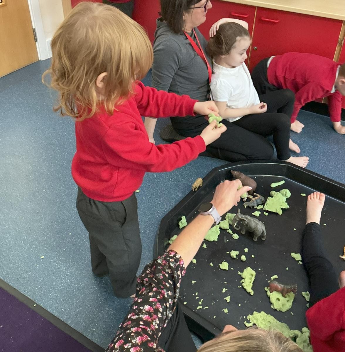 We all had fun foot printing with orange paint and creating green handprints, which are going to be cut out to create carrots for a display at the harvest festival in Ely cathedral. We have also explored cooked spaghetti and painting primary colours using large paint brushes during messy play sessions this week.