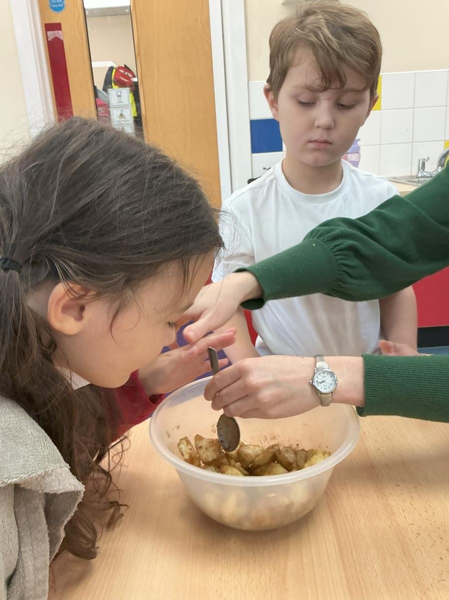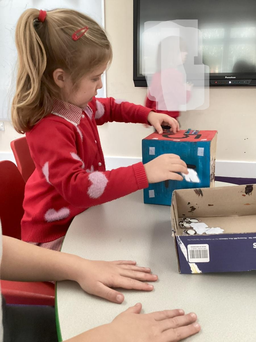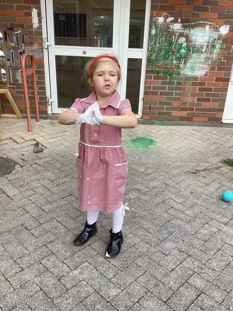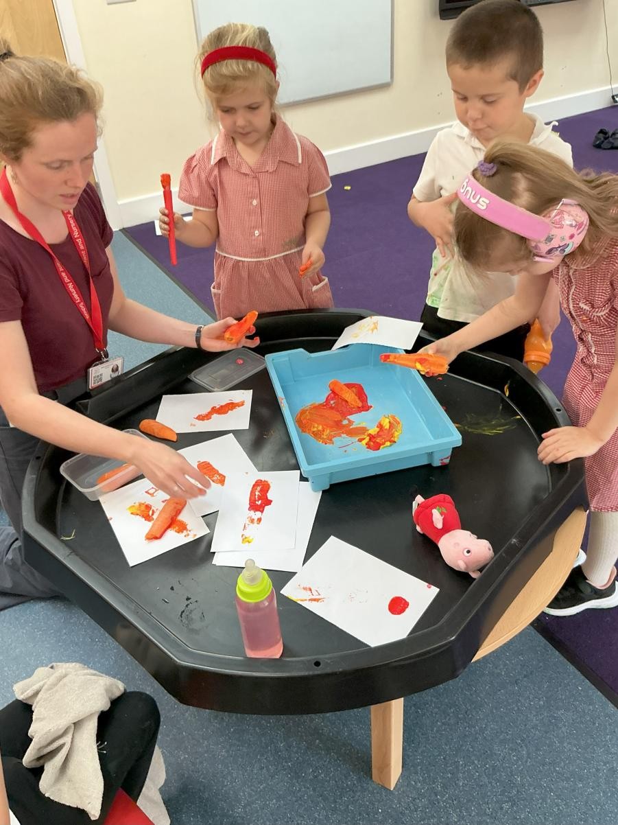 Sticking with last week's theme, we have been extending our learning based around Funny Bones. We have enjoyed being able to choose our favourite song from a selection of songs about our bodies and explored Ahlberg's illustrations in making our very own 'dark, dark street'. We printed carrots with carrots this afternoon for the Cathedral display, observing how red and yellow mix to make orange and carefully applying paint to our stamps.
