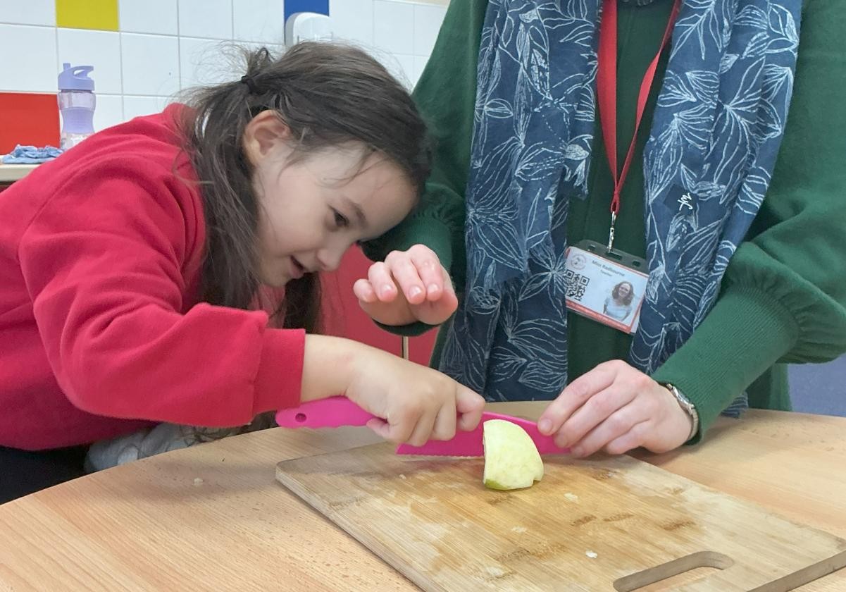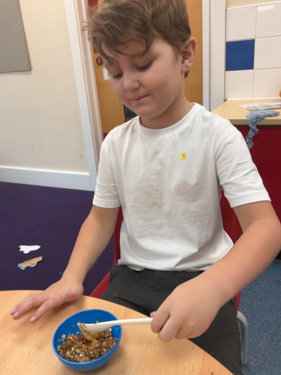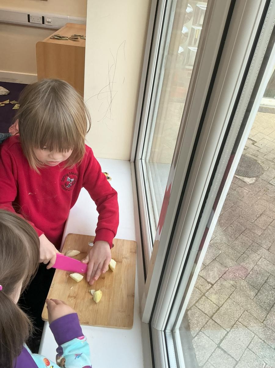 Is there a better story for young adventurers than Donaldson's The Gruffalo? The inspiration of the small and plucky mouse outwitting danger with imagination and courage is such a lovely story to set alongside the efforts that our children put into navigating their own worlds. And how we have delighted in talking about roasted fox and scrambled snake this week! We followed the instructive illustrations of Axel Scheffler to collage our own Gruffloes, focusing on his purple prickles and poisonous wart. We also enjoyed chopping and stirring to make apple crumble, Gruffaloes sadly being in short supply hereabouts.