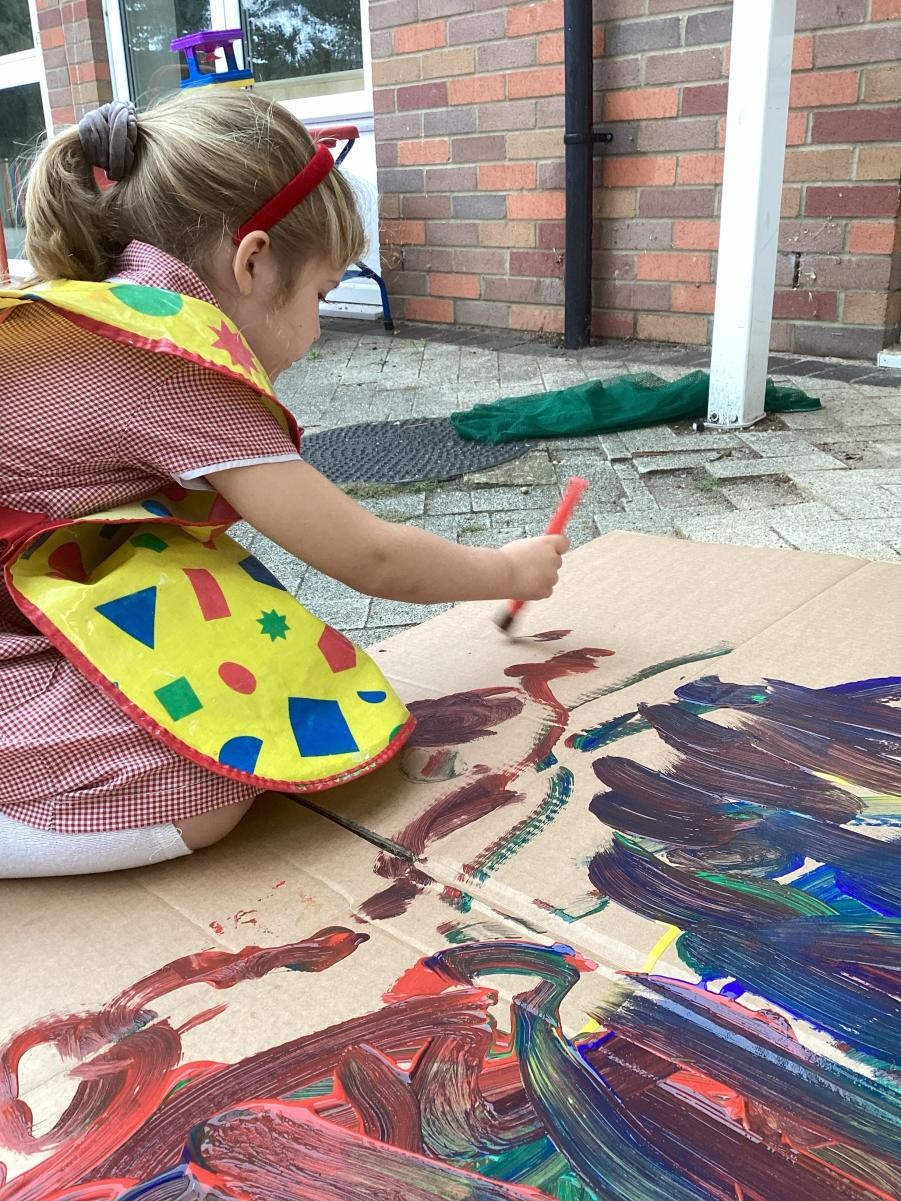It was rather exciting this week because the brown giant painting we had made last week transformed into a tree over the weekend. This gave everyone a good chance to play at being owl babies, peeking out of our own hole in the tree and also a cosy nook to regulate in when needed. While the weather still smiles upon us we've been enjoying our outside space, exploring the squish and slide of glittery foam (!), as well as painting in forest school.