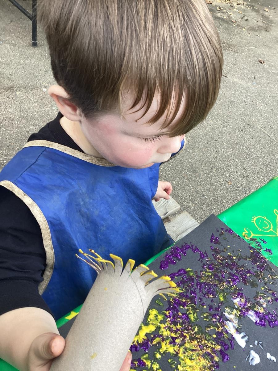 This week we have continued our learning about 'Real Heroes'. The children enjoyed mark making by running plastic emergency vehicles through the paint then moving the vehicles over the paper to see what marks the wheels made, some children also rubbed their hands in the paint and made different marks on the paper. We had a lot of fun in forest school, we found some pine cones and had so much fun practicing our balancing on the rope bridge.
