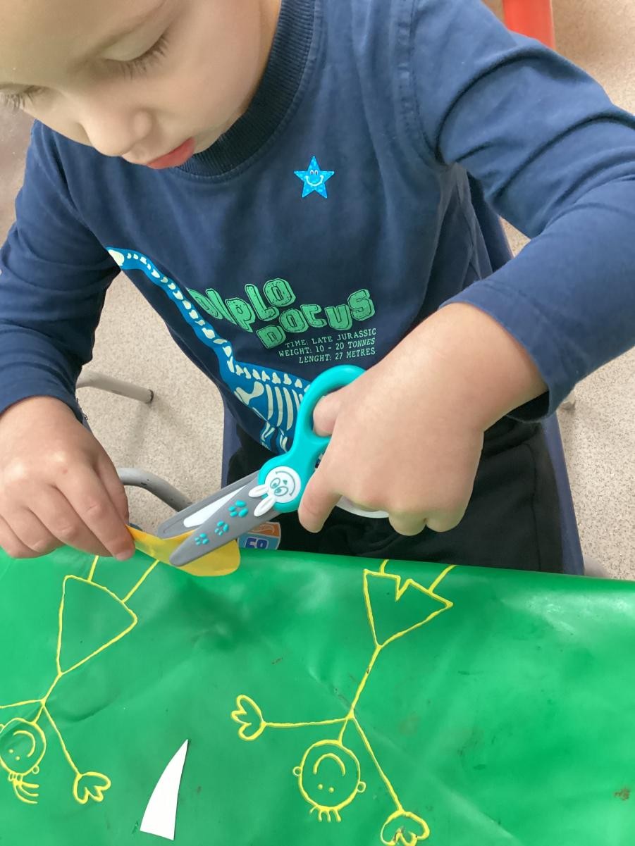This week we have continued reading 'The Naughty Bus'. Children have enjoyed searching the classroom each morning to look where our bus has been hiding, it has been all over from the top of the board to hiding behind the curtain tie. We have been making pictures of vehicles using different shapes of materials and other materials like lolly sticks. We have been practising our cutting skills by cutting along lines on the crazy hair picture.