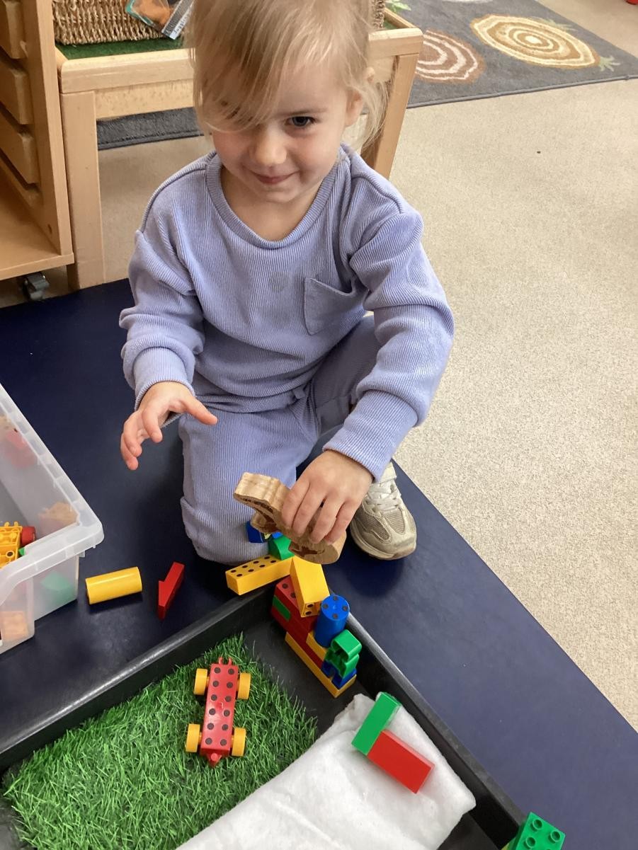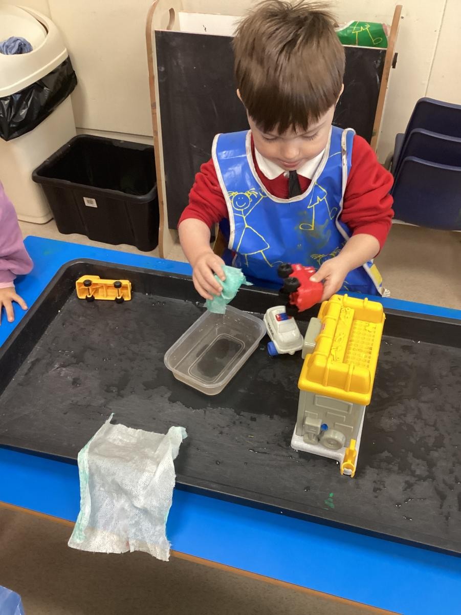 This week we have started our new book 'The Naughty Bus'. We have talked about where we would go on the bus, most of the children said to the seaside. We put a large piece of paper on the floor and the children had a lot of fun drawing where the Naughty Bus had gone. Messy play we had Weetabix and oats in a tray with different vehicles. Outside we have been using the crates and large wooden blocks to make our own vehicles. We have had lots of fun riding the bikes, scooters and cars on our roadway on the playground. It was lovely to see the parents who joined us for 'Rhyme Time'.