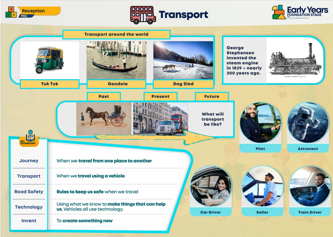 Transport is our topic for the second half term in Reception. We will be finding out about different types of transport, transport around the world, transport from the past as well as transport in countries with extreme weather conditions. The knowledge organiser below features key vocabulary that we will be teaching the children.