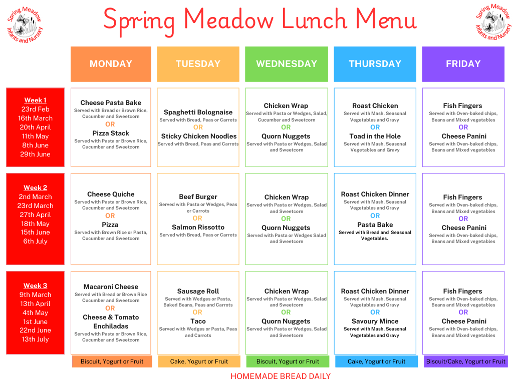 Here at Spring Meadow we continually strive to provide the very best for our children in terms of their education and also their meal provision and we are delighted to inform you that we have been awarded a fantastic 5 Star rating in the East Cambridgeshire ‘Scores on the Doors.’ As an infant school, all our children are entitled to a Universal Free School Meal. Our catering team has produced the autumn term menu (see link below) A dessert will be served daily or alternatively, yogurt or fresh fruit will be available. As always, we welcome your comments on our menu and your children’s feedback.