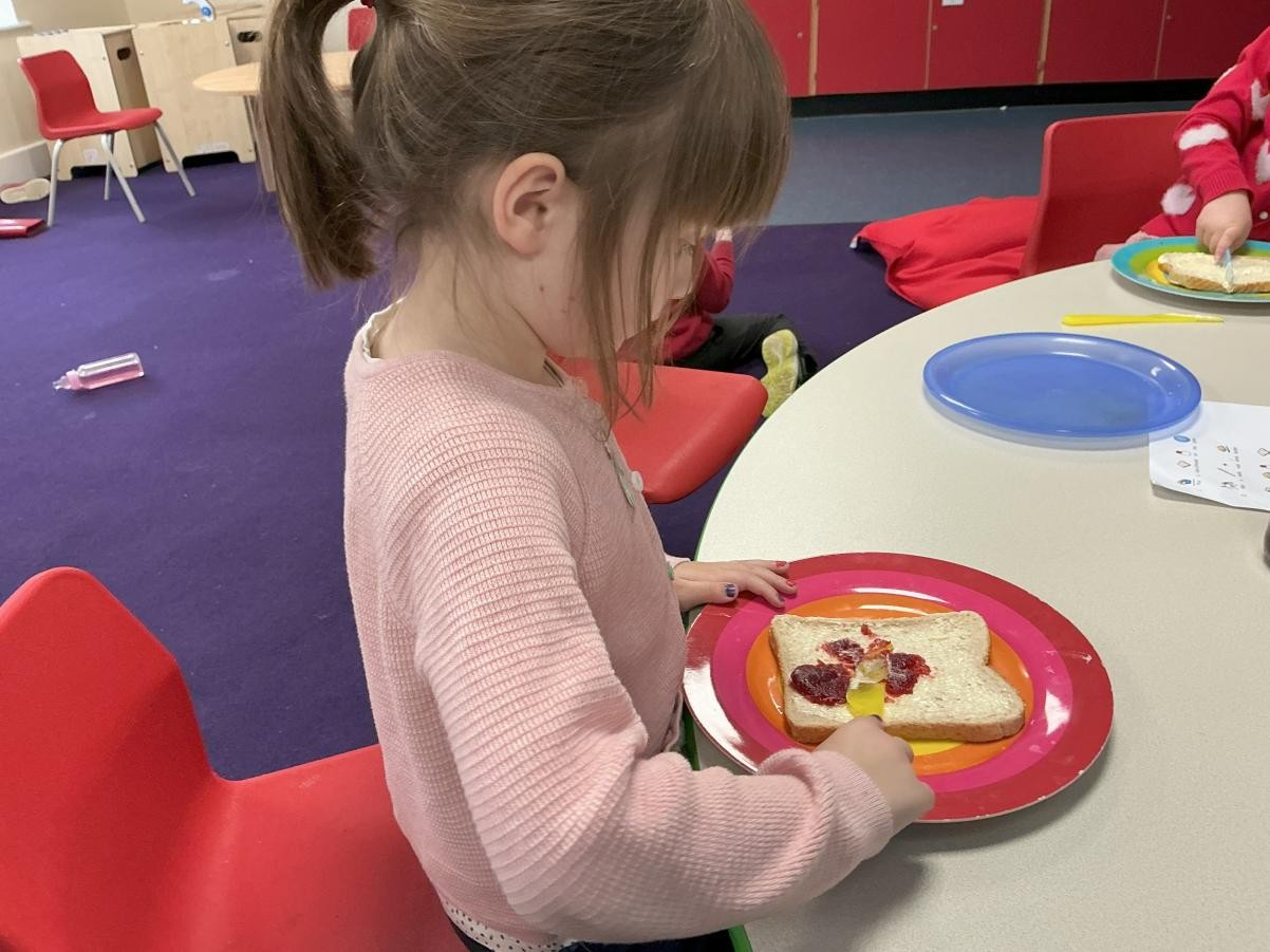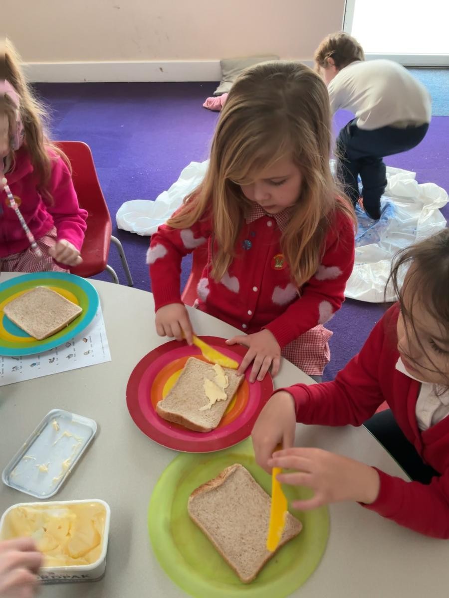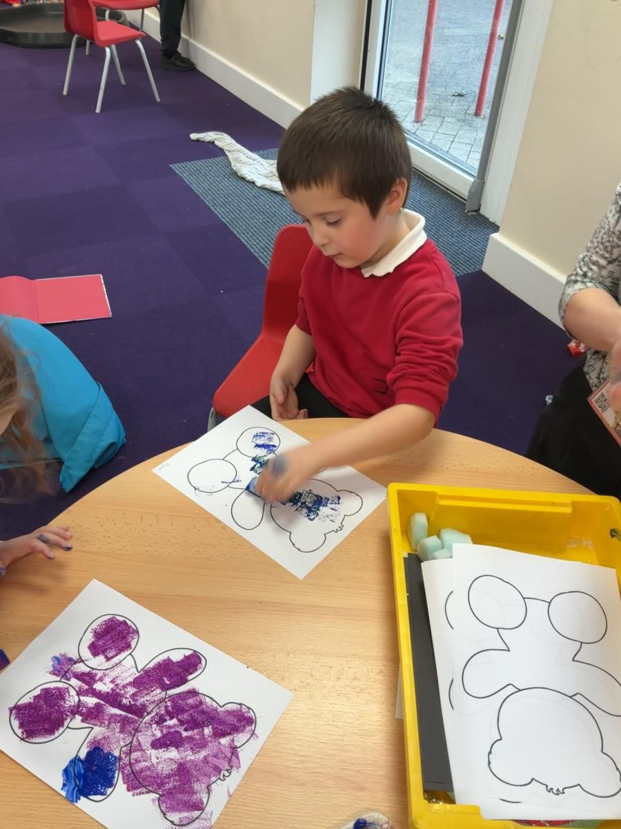 This week we have been enjoying the sensory story of Whatever Next, a lovely tale of soaring lunar ambition fulfilled by the endless mutability of cardboard boxes. Using sponges we made our own grubby teddies, although our enthusiasm for bright hues made ours rather more colourful than Baby Bear after his return via the chimney. Inspired by his exploits, we also made sandwiches, carefully following instructions and waiting until the whole sandwich had been made before tucking into our feasts.