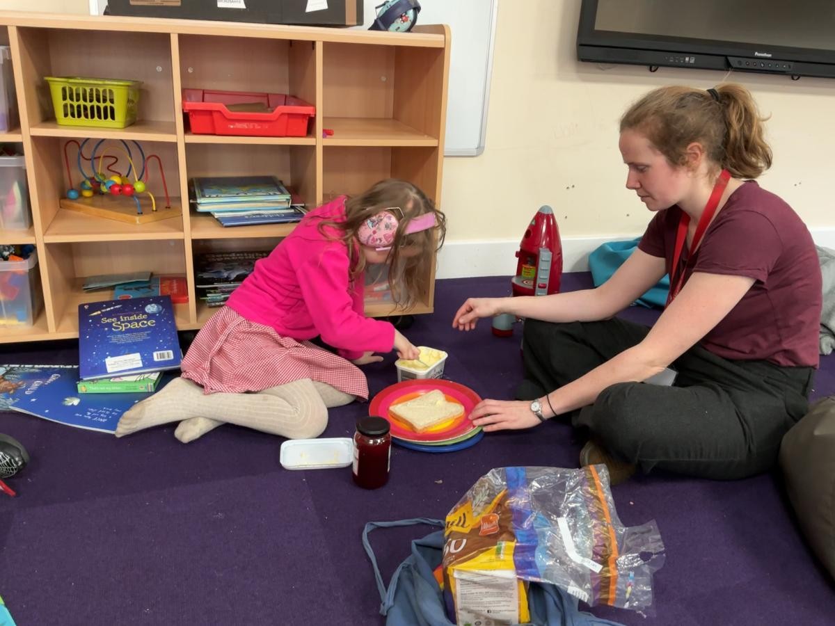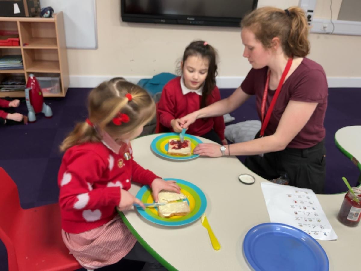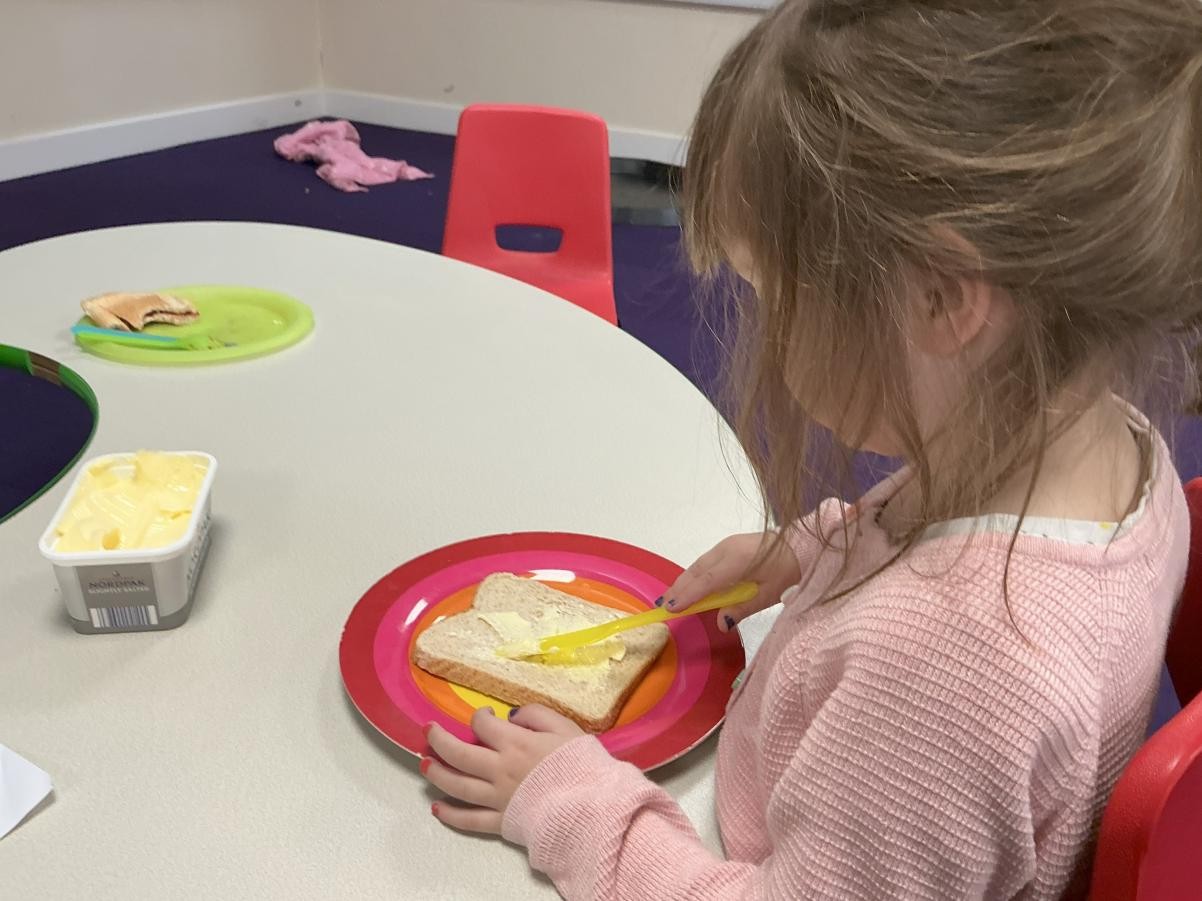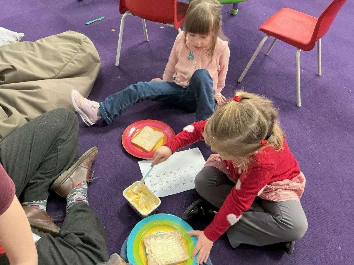 This week we have been enjoying the sensory story of Whatever Next, a lovely tale of soaring lunar ambition fulfilled by the endless mutability of cardboard boxes. Using sponges we made our own grubby teddies, although our enthusiasm for bright hues made ours rather more colourful than Baby Bear after his return via the chimney. Inspired by his exploits, we also made sandwiches, carefully following instructions and waiting until the whole sandwich had been made before tucking into our feasts.
