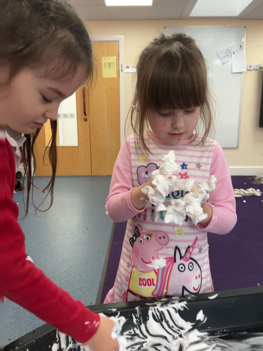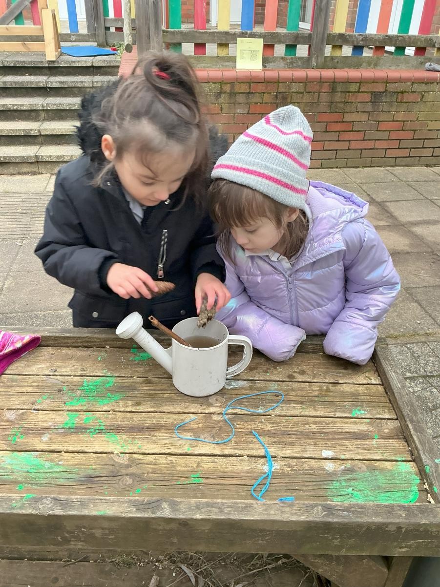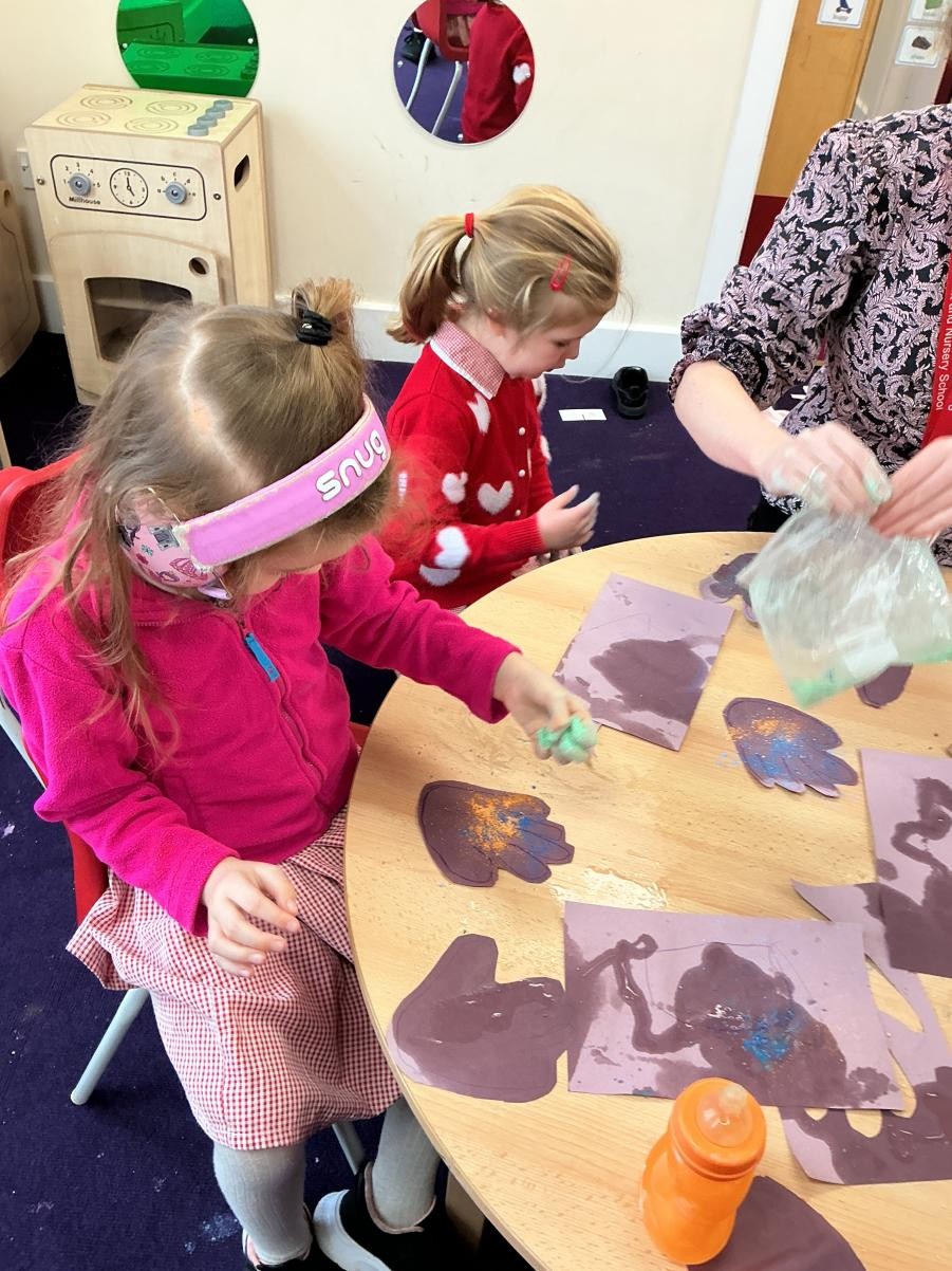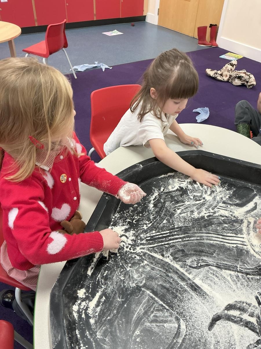 It would be foolish to hope that every January term might begin with snow but oh, what joy to have been so lucky this year! A world transformed, a playground covered in beautiful ice, children enthralled by throwing snowballs and watching their white footprints manifest their running. The inside of the classroom could hardly hope to meet such heights but we were glad to return to our school normalities, exploring new textures and mark making possibilities in messy play, strengthening our dexterity in dough gym sessions and, of course, forest school. We also enjoyed the sensory story of Room on the Broom - especially enjoying the whoosh of the broom flying down to the ground and such a likeable cast of characters - and made our own wands and horrible beasts out of chocolate cereal cakes.