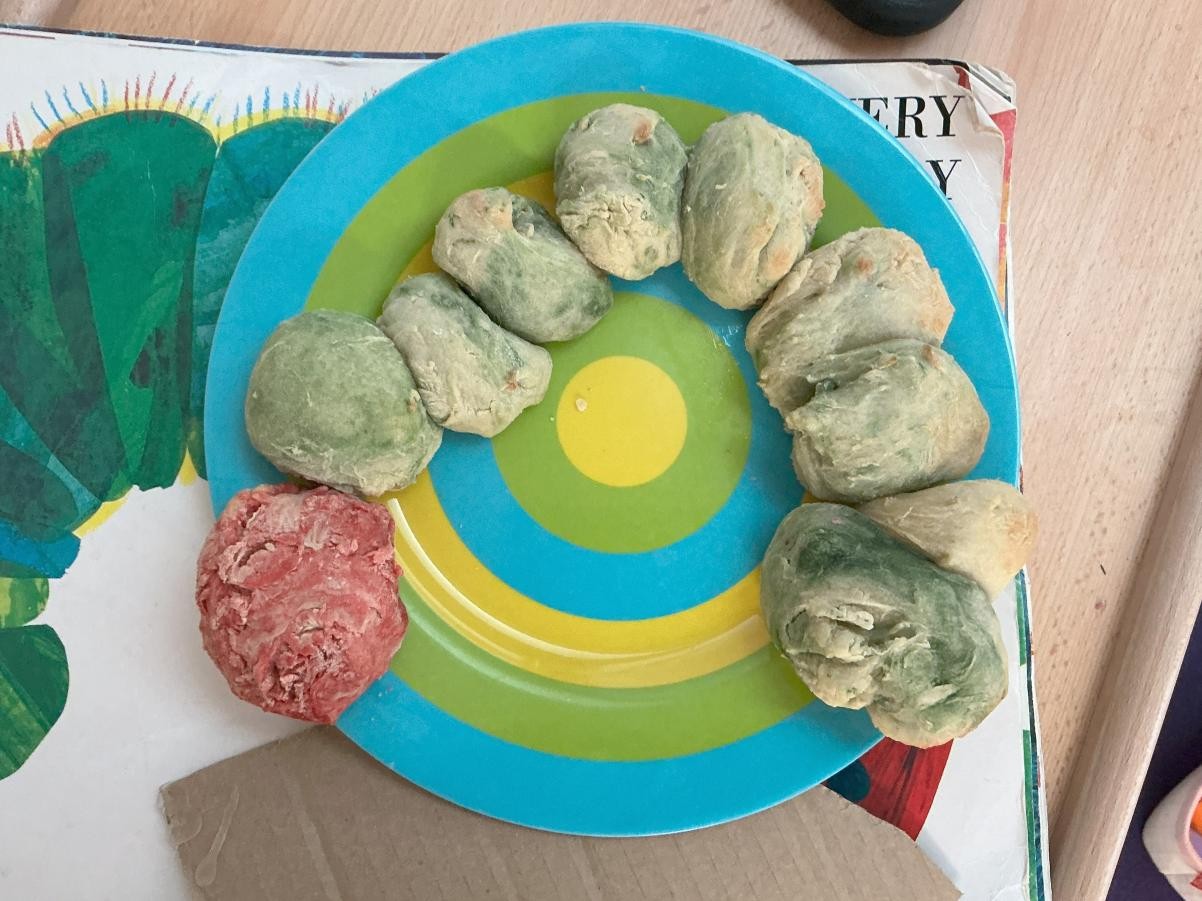 We have been thriving on a pure diet of The Very Hungry Caterpillar this week. We have reread it regularly, with and without its sensory elements and enjoyed practising threading caterpillars through fruit. In the role-play area we have also taken glee in being caterpillars, curling in cocoons and, most importantly, transforming into butterflies. Inspired, we also made a very hungry caterpillar from bread dough which we tried, even if we did not devour it with quite the same gusto as the eponymous caterpillar.