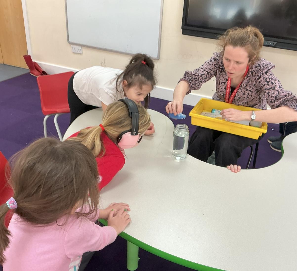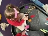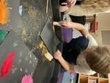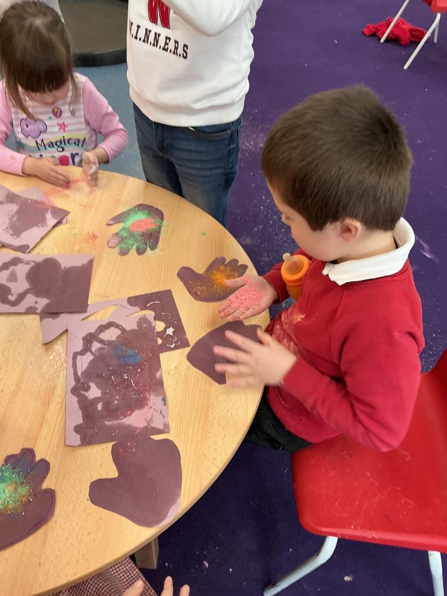 We continued to explore the creative potential of feeding off Room on a Broom this week. We used chalk and glitter to make our own magic drawings, inspired by the 'Iggety, ziggety, zaggedy, zoom' illustration and enjoyed mixing potions in our own cauldrons. In more practical magic, we watched the interesting interaction of dyed oil and water during our 'attention autism' sessions.