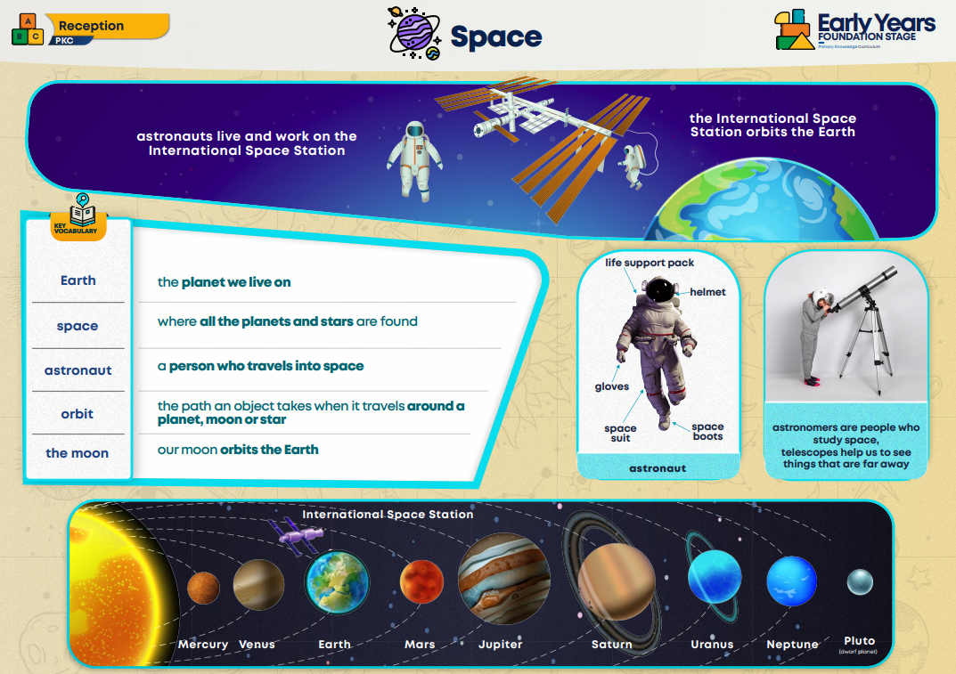 Space is our topic for the first half term of the Spring term. We will be finding out about what makes the Earth a good place for humans to live, astronauts and what it is like to live on the International Space Station, the stars and space exploration. The knowledge organiser features key vocabulary that we will be teaching the children.