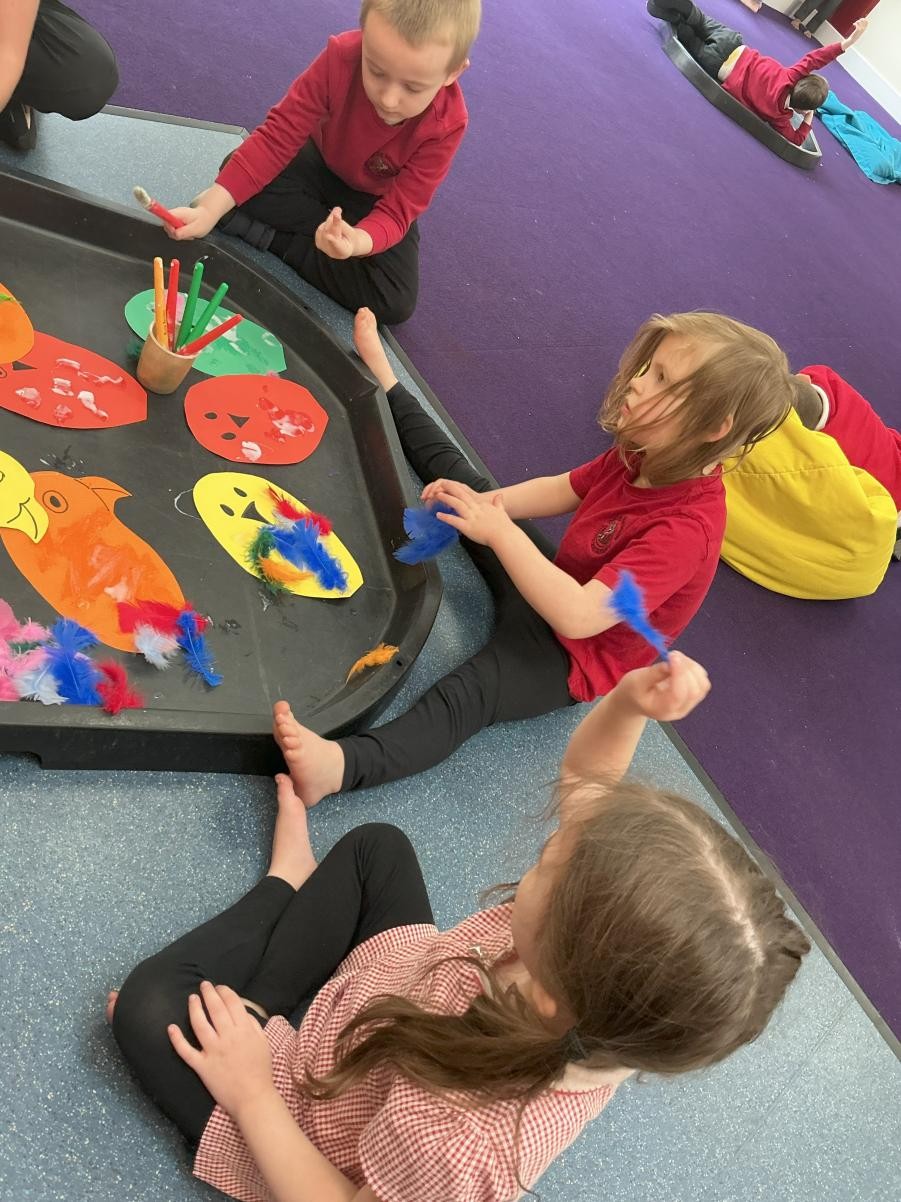 This week in Maths we have loved the number rhyme about 5 monkeys swinging in a tree. We used a crocodile puppet to snap the monkeys out of the tree! We also listened to the monkey puzzle story and enjoyed meeting all the cuddly animals we used in the sensory story. We have got very messy with paint this week, using rollers to make tree trunks and printing on foil to make leaves. We got sticky using feathers and glue to make parrots. We were all very engaged in the music session and listened to a classical piece of music often used with clips of wild animals travelling in Africa.