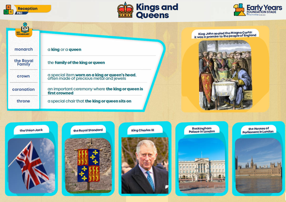 This half term our topic is Kings and Queens. We will be learning about the royal family, castles and palaces, coronations, King John and the Magna Carta and our government. We will role play being kings and queens at a coronation and building castles and thrones, being the king's guards and voting. At the end of our topic we will host a royal themed garden party.